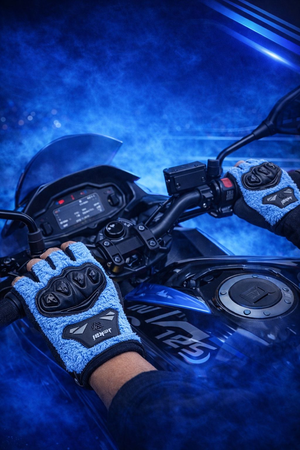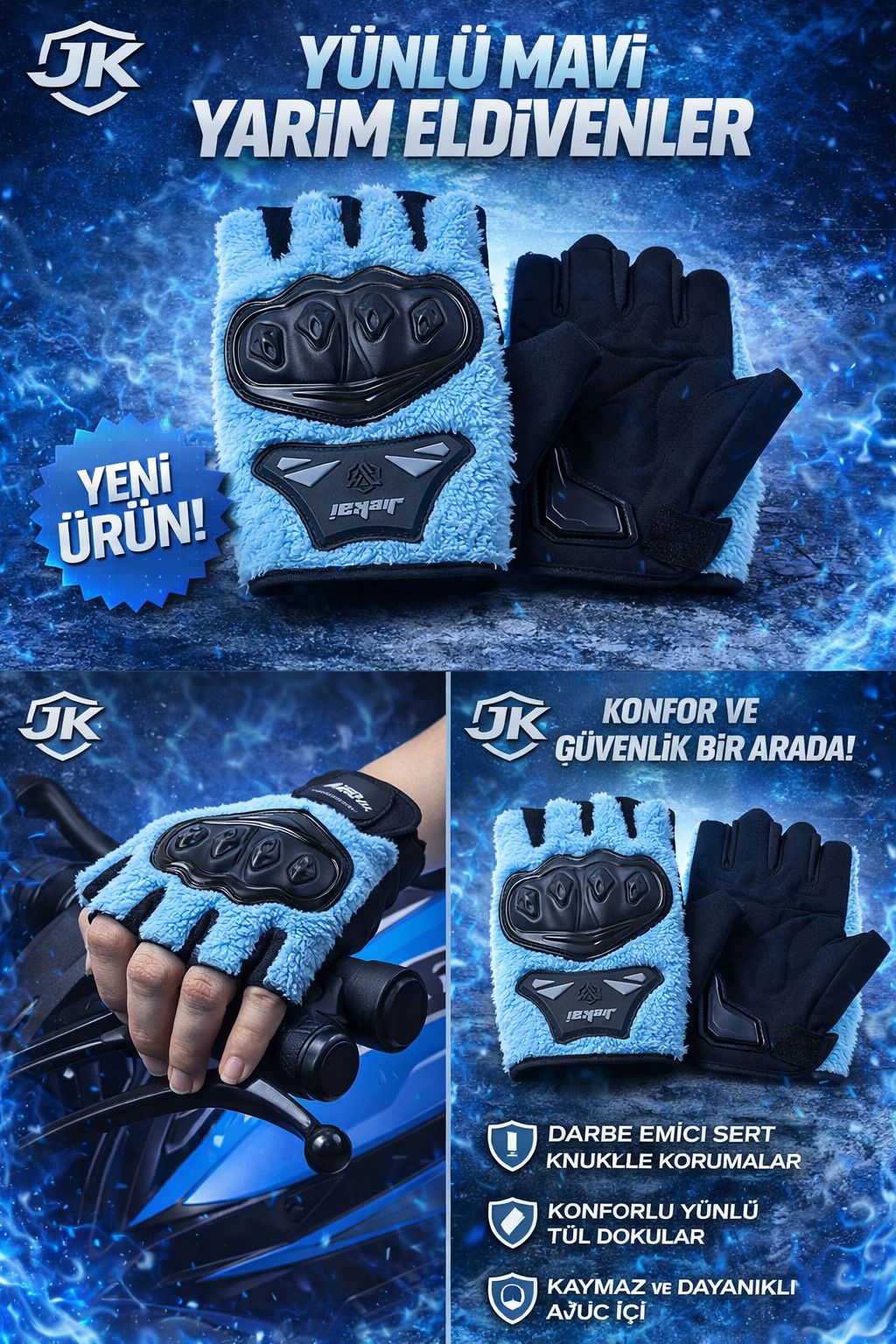 JK Peluşlu Yarım Eldiven, soğuk havalarda konforu artırmak ve sürüş keyfini korumak için özel olarak tasarlanmıştır. Yumuşak dokulu peluş yapısı ve modern mavi rengi ile hem estetik hem de fonksiyonel bir kullanım sunar. Günlük kullanım ve motosiklet sürüşleri için ideal bir üründür.